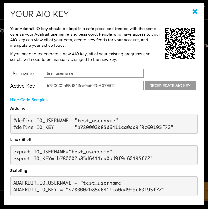 NOTE: if you regenerate your AIO key, your old key will be immediately invalidated, so you'll have to replace it in any scripts or sketches where it is in use.