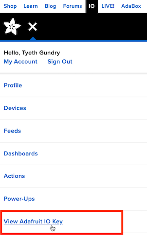 Or by clicking on the "View Adafruit IO Key" link in the small screen drop-down menu while you're visiting Adafruit IO.